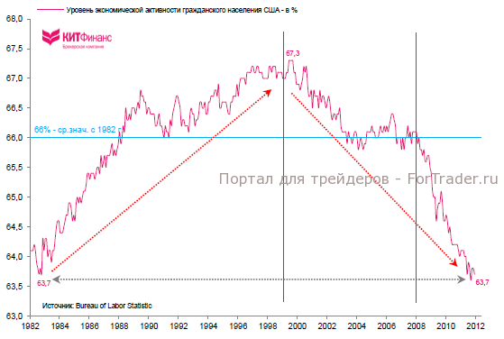 Среднее значение уровня экономической активности гражданского населения США с 1982 г. приблизительно равно 66%. С учетом того, что среднемесячный прирост гражданского населения составляет примерно 213 тыс. чел., каждый последующий месяц для поддержания уровня занятости хотя бы на прежнем уровне (т.е. с учетом растущего населения) необходим прирост занятых как минимум на 140,5 тыс. чел. — среднемесячное увеличение числа рабочих мест в американской экономике с начала 2010 г. (с учетом сентябрьских “аномалий”) составляет 152 тыс. О каком уверенном восстановлении рынка труда США идет речь?