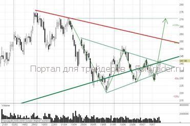 Но, во-первых, линия 240 рублей — это линия размазанного «симметричного треугольника», около нее котировки еще попилят. А, во-вторых, что сейчас этот поход на 255? Максимум 6% прибыли… Вот знать бы, что бумага после мытарств таки пойдет на 270, я бы рискнула, даже готова была бы парочку «лосей» выпасти. Тем не менее, у каждого свои приоритеты, может быть, вам цель 255 рублей покажется заветной звездой.