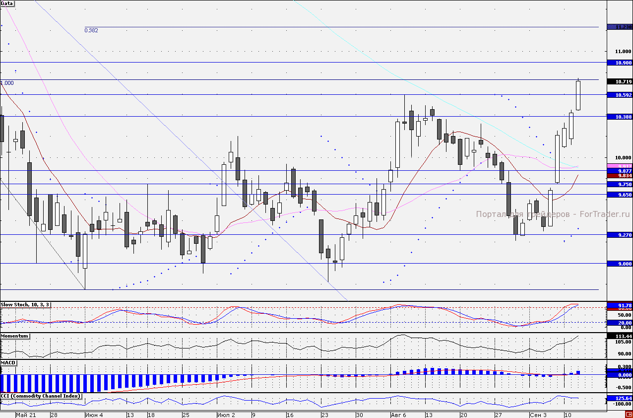 Позитивную динамику сегодня демонстрируют акции ММК, тестируя ближайшее сопротивление 10,70 руб. При закреплении бумаг выше данной отметки следующей целью выступит 10,90 руб., а затем и 11,30 руб., где проходит уровень коррекции по Фибоначчи, проведенной между максимумом августа и минимумом июня текущего года. Судя по техническим сигналам позитивная динамика акций может быть продолжена. График индикатора Momentum направлен вверх, при этом сигнальная линия MACD (12;26;9) находится на положительной территории. Наш 5-минутный торговый робот пока удерживает длинные позиции от отметки 10,499 руб. Таким образом, рекомендую наращивать длинные позиции по бумагам с целью достижения 11,30 руб., однако не стоит пренебрегать «стопами», поскольку наличие дивергенции между графиком осциллятора CCI (9) и графиком акций, свидетельствует о том, что «медведи» в любой момент готовы перехватить инициативу в свои руки.