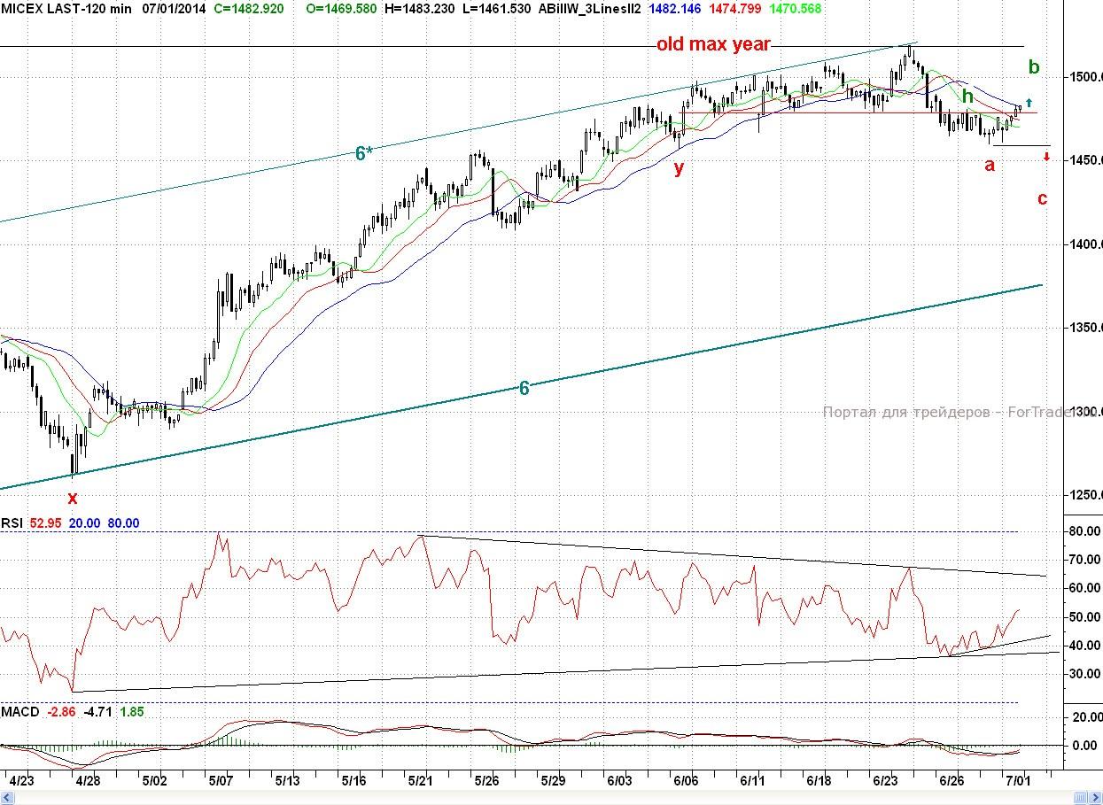 Исследуя 2-часовой график индекса ММВБ, видим, что открывшись с небольшим гэпом вниз, котировки возобновили снижение предыдущих дней. Однако, продажи были неагрессивные, и ближайшая поддержка в лице минимума понедельника a (1 460,42 п.) справилась со своей ролью. От данного района начались покупки, и к обеду котировки вышли на положительную территорию. А ближе к окончанию торгов они преодолели и вязкую зону сопротивления, которая раньше была поддержкой (уровень ~1 480 п., и 2- часовой фрактал на покупку h (1 481,15 п.)). В результате день завершился в небольшом плюсе (0,44%). Но индекс РТС за счет ослабления рубля снизился на 0,29%.