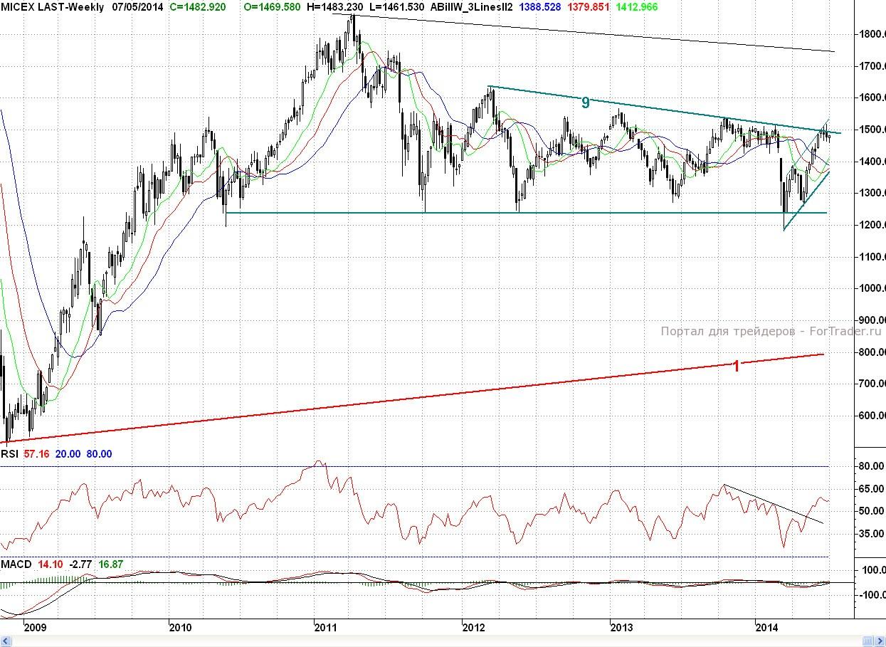 С технической точки зрения на 2- часовом графике бычьи дивергенции сработали, и индекс ММВБ по Б. Уильямсу снова вошел в длинную позицию, а по дням он из нее и не выходил, что является плюсом для покупателей. Однако, звоночек о том что, потенциальный разворот произошел, уже прозвенел двумя днями ранее, поэтому этот рост пока будем рассматривать как коррекционный, в рамках формирования заходной дневной падающей волны (а-b). В этом случае ближайшим сопротивлением выступит уровень 50% коррекции (~1 490 п.) от четырехдневного снижения, а далее уровень 62% (~1 497 п.). В этом же районе проходит и верхняя грань (9) треугольника (см. недельный график.) И если покупатели уверенно преодолеют данный рубеж, то дорога на годовой максимум (1 519,04 п.) будет открыта. Но и про оборону быкам необходимо постоянно помнить. Ближайшей поддержкой выступит вчерашнее сопротивление (~1 480п.), а далее послеобеденный минимум вторника (~1 470 п.). Ключевым редутом быков теперь станет минимум понедельника a (1 460,42 п.). Он же с большой вероятностью станет и новым дневным фракталом на продажу.