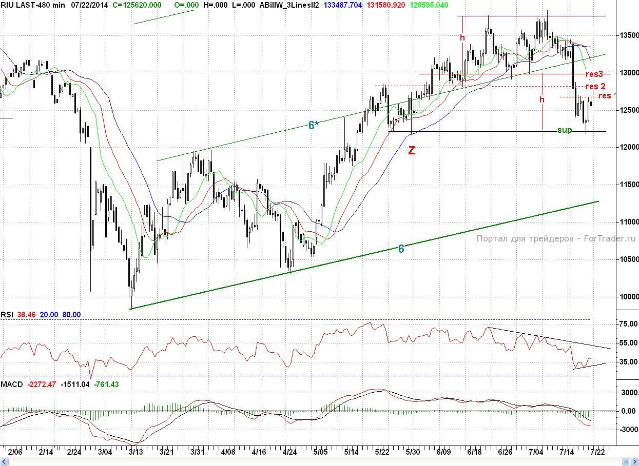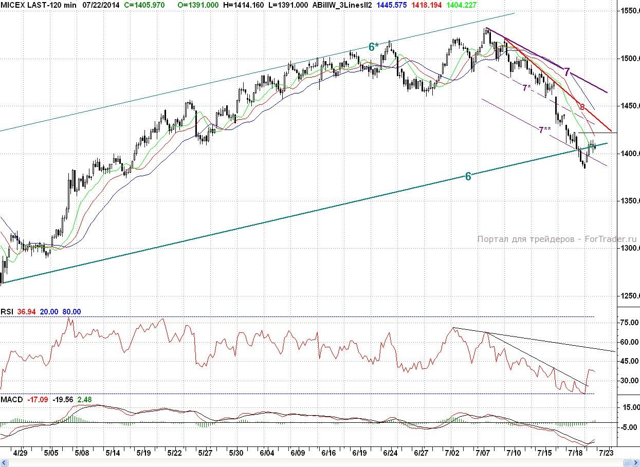 С технической точки зрения индекс ММВБ и по 2- часам и по дням находится в продаже, при этом бычьих дивергенций не образовалось. К тому же в тылу у быков осталось вчерашнее незакрытое окно, да и объемы торгов на росте были меньше чем в предыдущие три «ударных» медвежьих дня. Так что цены обновят недавний минимум. Однако, сейчас покупатели на подъеме, по крайней мере эмоциональном, так что рост может и продолжиться. В этом случае ближайшим сопротивлением выступит незакрытое окно понедельника (~1 422 п.). Напомним, что всего с начала стремительного падения с 16 июля образовалось три разрыва. Более сильным медвежьим редутом выступит второе «широкое» незакрытое окно (1 430 — 1 440п.п.). Немного выше проходит и уровень 38% коррекции (~1 441 п.) от всего снижения. Роль ближайшей поддержки сыграет вчерашний вечерний минимум (~1 401 п.), а далее нижняя граница падающего канала (7- 7*) (~1 392 п.) и широкое незакрытое окно вторника. Основным бычьим редутом теперь будет уровень 50% коррекции (~1 360 п.) от весенне — летнего роста.