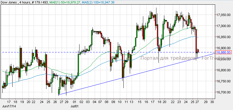 Фондовый рынок США завершил торги в красной зоне: NASDAQ потерял от стоимости 0.45%, Dow Jones упал на 0.72%, a S&P 500 упал на 0.48% Индексы упали после выхода слабых квартальных отчетов о доходах компаний Visa и Amazon. Согласно техническому анализу 4-часового графика, Dow Jones удержал линию восходящего тренда и торгуется выше уровня поддержки 16,825. Прорыв ниже данного уровня приведет индекс к следующему уровню поддержки 16,750, а задержка выше вызовет рост индекса к отметке 16,950.