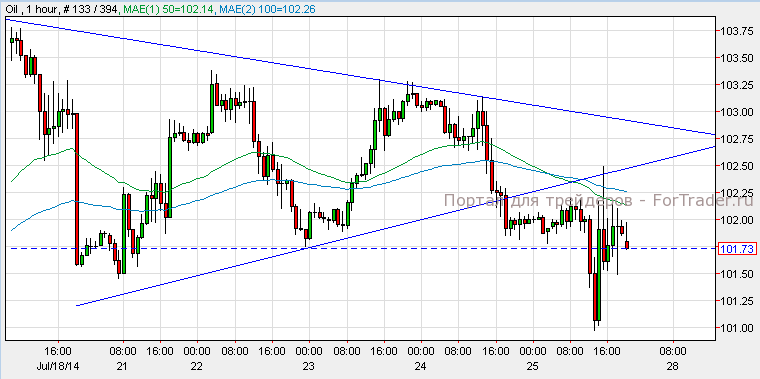 Нефть подешевела до $101.70, поскольку индексы на Уолл-стрит закрыли торги снижением. Согласно техническому анализу 1-часового графика, прорыв ниже уровня $101.50 приведет нефть к отметке $101.00, а задержка выше уровня поддержки вызовет рост черного золота к отметке $102.50.