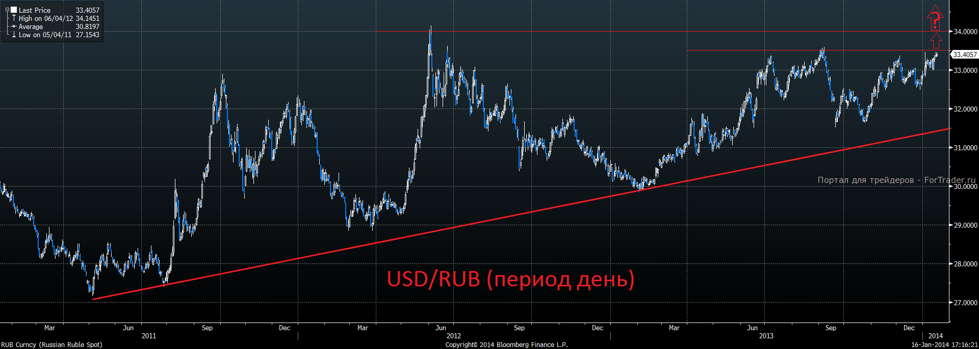 Российская валюта медленно, но уверенно подобралась к сильному сопротивлению на отметке 33.4 в паре с долларом. Цель на отметке 34 мы пока считаем актуальной.