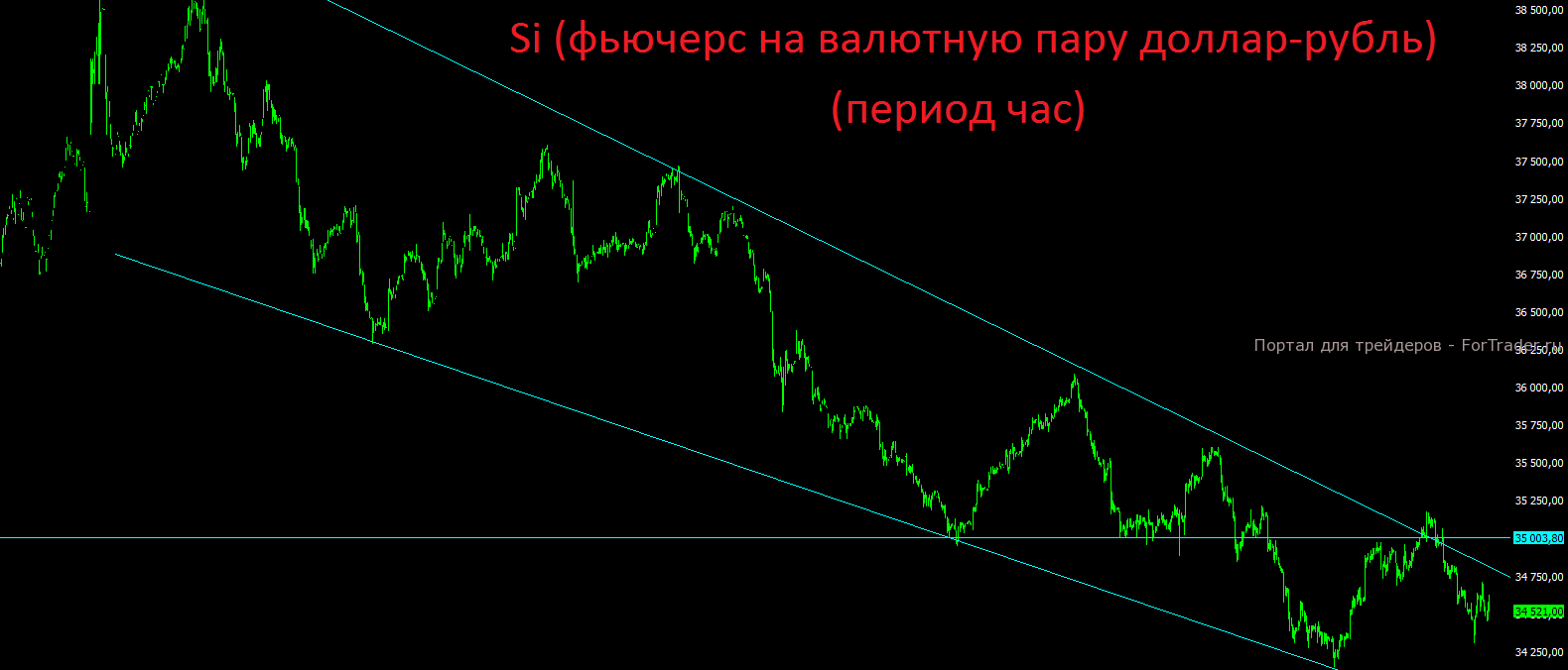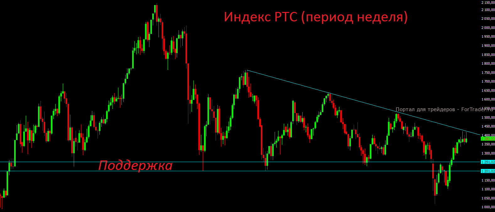 На недельном графике валютный индекс РТС продолжает уже третий год находиться в понижательном тренде и сейчас также высока вероятность увидеть новые распродажи от сильного диагонального сопротивления. После 5 недель консолидации выход может быть в любую сторону очень сильный.