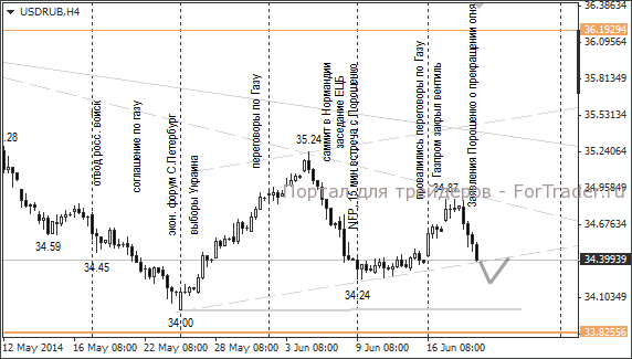 Рубль отбился от важных ценовых уровней благодаря заявлениям президента Украины П. Порошенко о временном прекращении военных действий на юго-востоке страны и новостях из Ирака. Котировки на нефть марки Brent достигли отметки в 114,50 долларов за баррель.