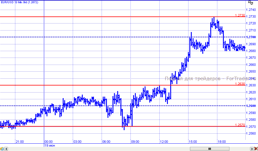 Вторник оказался для евро удачным. Первую половину торговых суток пара провела в пределах диапазона 1,2570 – 1,2630. Но на американской сессии цены смогли преодолеть сопротивление 1,2630 и продолжили подъем, в рамках которого зафиксировались выше уровня 1,2700. Максимум торговых суток был отмечен на уровне 1,2730. Но к завершению дня цены откатились к отметке 1,2680.
