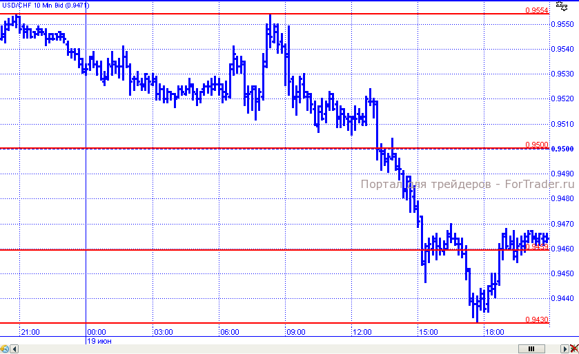 В первой половине торговых суток пара доллар/франк предприняла попытку укрепиться, но она оказалась не слишком удачной. Цены поднялись от отметки 0,9554, от которой начали довольно решительное снижение, а рамках которого смогли преодолеть поддержку 0,9500 и 0,9460/0,9450. Внутридневной минимум был отмечен на уровне 0,9430. Однако, к завершению дня цены снова закрепились чуть выше уровня 0,9460.