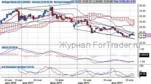 Согласно показаниям индикатора Bollinger Bands, после разворота от нижней границы динамического канала на уровне 24.00 котировки фьючерса обрели потенциал роста до уровня 26.00 цента/фунт – верхняя граница среднесрочного динамического канала.
