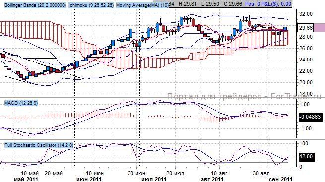 Согласно показаниям индикатора Bollinger Bands, отмечаем разворот вниз и консолидацию в середине торгового канала после выхода за верхнюю границу динамического канала на уровне 31.50 центов/фунт. После периода консолидации отмечаем понижательное движение с ориентиром на нижнюю границу – 28.00 центов/фунт.