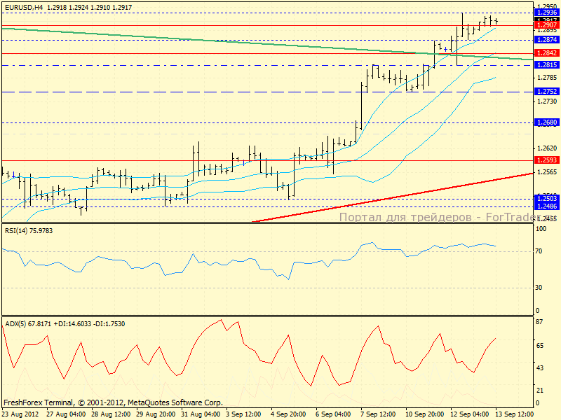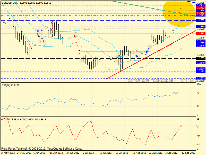 Дневной график: мы видим то, что видим, а именно — пробитую среднесрочного нисходящего тренда, стартовавшего в феврале, но на фоне рядом располагающейся глобальной трендовой (от апреля 2011-го, см. синюю линию), сильнейшей перекупленности, а так же предполагаемого места «стыковки» ап-движения с ТЛ (1.2985-1.30, т.е. колоссальной значимости психологической зоны) можно предположить, что если медведи не перехватят инициативу на текущих уровнях, то это случится не позднее 1.30, откуда произойдет сильнейшая нисходящая коррекция, или же начнется новая волна падения евро. Средняя Боллинджера находится почти в 400 пунктах под текущей ценой, верхняя — на 1.2752. Все эти отметки представляют собой серьезные потенциальные цели для коррекционного перестроения и разгрузки индикаторов.