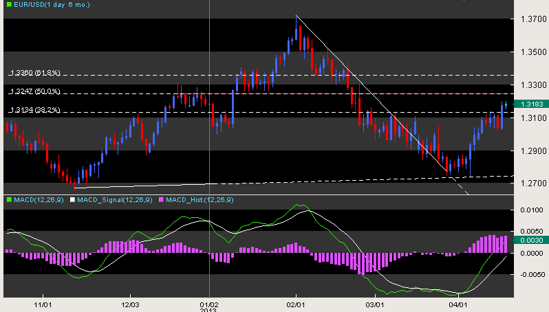 При этом еще вчера европейской валюте удалось пробить отметку 1,31 и добраться до следующего сильного сопротивления в виде 1,32. Теперь, наиболее вероятным является боковая динамика пары у достигнутых отметок с незначительной тенденцией к росту в район 1,325, где находится 50% коррекции по Фибоначчи к волне снижения. Поддержку евро могут оказать данные по платежному балансу еврозоны за февраль, которые выйдут в текущую пятницу.