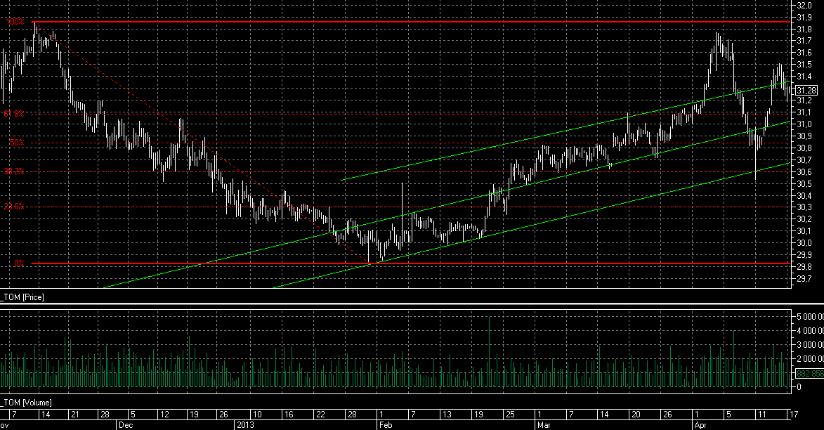 Российская валюта, как и предполагалось, смогла добраться до отметки 31,3 и сейчас консолидируется у данного уровня. Немалая заслуга данного роста лежит на плечах Банка России. ЦБ накануне продал чуть более 50 млн долларов, чем и оказал поддержку российской валюте. Между тем сегодня регулятор может продолжить продажи валюты для поддержания российского рубля, т.к. бивалютная корзина снова выше 35,5. Дополнительную поддержку для рубля будут оказывать также предстоящие крупные налоговые выплаты, которые произойдут уже в понедельник следующей недели. Тем временем нефтяные котировки постепенно стабилизируются возле отметки 100 долларов за баррель, и если их динамика не будет ухудшаться, то вышеперечисленные факторы на определенное время смогут вернуть рубль в район 31.