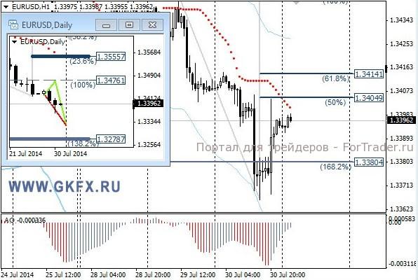 Цены на золото резко колебались во время публикации данных по ВВП США. Тем не менее, две цели были достигнуты, и стоп можно было перевести на уровень безубытка. К сожалению, спустя несколько минут безубыток сработал. Данные по ВВП США за второй квартал оказались очень хорошими и дают шанс на более раннее повышение процентных ставок ФРС, хотя вчерашнее заседание этого не подтвердило. Однако можно с уверенностью сказать, что если данные продолжат показывать такие результаты, то намеки на скорое повышение процентных ставок не заставят долго ждать. Сегодня возможно цены будут консолидироваться. Традиционно делаю два варианта движения цены на неделю, основной красный и альтернативный зеленый. Значимые уровни на сегодня отмечены на часовом графике. Индикатор АО находится в отрицательной зоне и растет, указывая на коррекцию перед возможным продолжением снижения. Индикатор тренда указывает на снижение. Вне рынка.