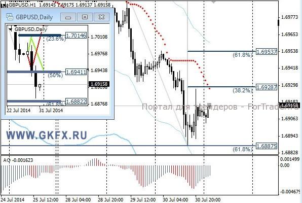 Пара EURUSD возобновила снижение на сильных данных по ВВП США за второй квартал. Запрыгнуть в поезд не удалось, так как отката вверх было недостаточно. Опять перестраховываюсь, чтобы снизить стопы и в итоге упустил движение. Позднее вечером закончилось заседание ФРС США, и последовавшие заявления никак не указывали на возможно более быстрое повышение процентной ставке в будущем. Сегодня выходит много статистики по Европе, поэтому может проявиться разнонаправленная динамика. На эту неделю традиционно рассматриваю два варианта возможного движения цены, основной красный и альтернативный зеленый. Значимые уровни на сегодня отмечены на часовом графике. Индикатор АО находится в отрицательной зоне и растет, указывая на коррекцию перед возможным продолжением снижения. Индикатор тренда указывает на снижение. Вне рынка.