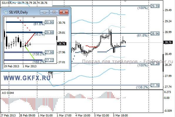 Цены на золото продолжают коррекцию в диапазоне пятницы. Вчера сформировался вновь внутренний бар по отношению к пятнице на дневном графике. Это значит, что цена вероятней пойдет вверх, и серебро это подтверждает. На дневном графике традиционно делаю два варианта движения цены на неделю, основной красный и альтернативный зеленый, склоняюсь к красному. Значимые уровни на сегодня отмечены на часовом графике. Индикатор АО находится у нуля, указывая на неопределенность. Индикатор тренда указывает на снижение, но его сейчас можно не смотреть. Buy 1572.00 или ниже со стопом 1565,00. Цель 1585,00.