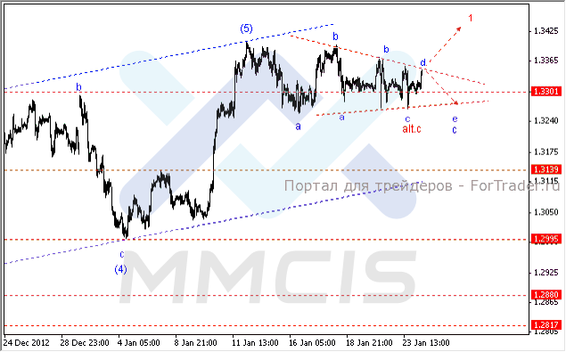 В качестве основного сценария на сегодня можно рассматривать сначала повторный откат пары до уровня поддержки вблизи отметки 1.3270 в виде удлиненной волны «3», а затем — укрепление курса в направлении сопротивления 1.3400, в виде восходящей волны «4». Однако не стоит исключать и альтернативного варианта, при котором возможен дальнейший рост пары в виде фигуры «Alt:4».