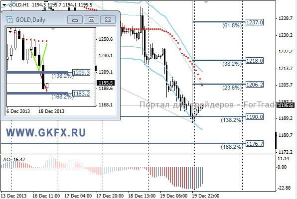 Цены на золото вчера вопреки моим предположениям преодолели 1211,0 и направились вниз. Я совершил большую ошибку вчера, приняв минимум 1211,0 самым низким в этом году. На торговле это не отразилось, но планы поменялись. Теперь все ранее написанное актуально для отметки 1180,0. Повторюсь, смущает количество желающих продать, соответственно возможен маневр, чтобы всех удовлетворить, а потом вытряхнуть и направить цены вниз. Думаю, что первое прохождение отметки 1180,0 будет ложным. По рекомендации цена не достигала точки входа в рынок. Традиционно делаю два варианта движения цены на неделю, основной красный и альтернативный зеленый. Значимые уровни на сегодня отмечены на часовом графике. Индикатор АО находится в отрицательной зоне и растет, указывая на коррекцию перед возможным продолжением снижения. Индикатор тренда указывает на снижение. Продажи от 1200,0 с целями 1190,0 и 1177,0.