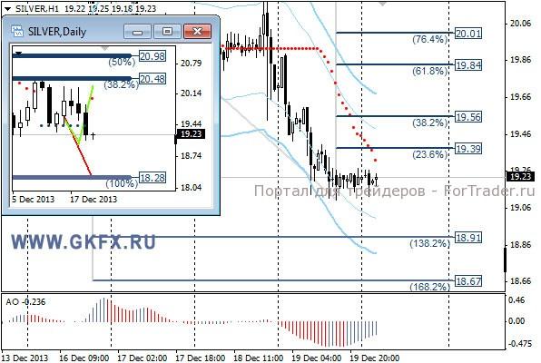 Цены на серебро значительно снизились и готовятся к продолжению снижения. Ключевая отметка 18,30. До этого уровня цены могут снижаться не испытывая сильного сопротивления. Традиционно делаю два варианта движения цены на неделю, основной красный и альтернативный зеленый. Значимые уровни на сегодня отмечены на часовом графике. Индикатор АО находится в отрицательной зоне и растет, указывая на коррекцию перед возможным продолжением снижения. Индикатор тренда указывает на снижение. Продажи от 19,25 с целями 19,00, 18,90 и 18,70.