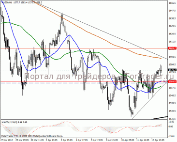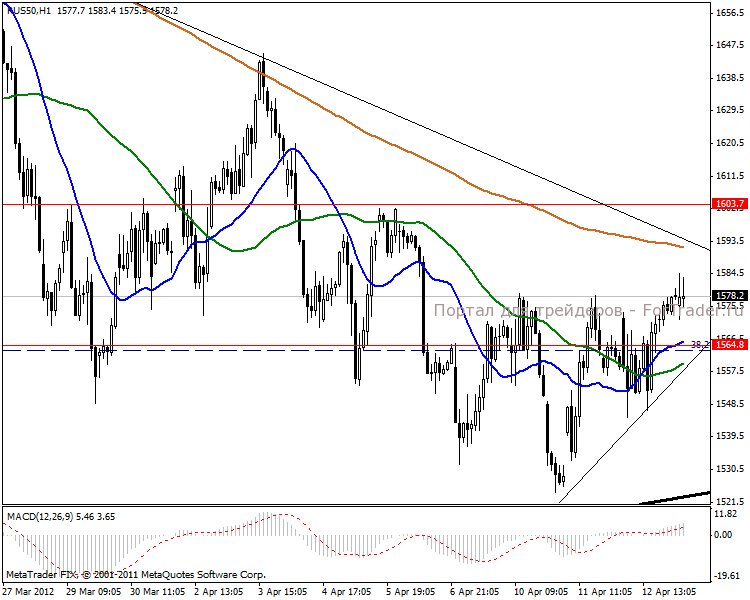 Часовой график рисует разнонаправленность дальнейшего движения. В краткосрочной перспективе ситуация остается достаточно неопределенная, вероятнее всего протянется боковик, окончательная цель 1587 пунктов.
