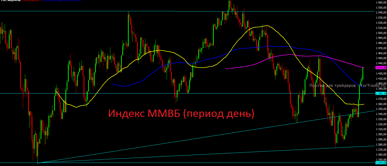 Всё что произошло, больше похоже на принудительное закрытие крупных коротких позиций, которые были набраны ещё в июне. Тому свидетельствует бурный рост акций Газпрома и почти вертикальный взлёт фьючерса на индекс РТС при существенном падении открытого интереса. На текущий момент техническая картина по российским индексам показывает очень сильную перекупленность, причём уже не только на часовом, но и на дневном периоде, поэтому тем, у кого ещё остались длинные позиции, мы рекомендуем их смело скидывать, а краткосрочным спекулянтам можно даже пробовать открывать короткие позиции со стопом не более 1.5%. Российский индекс ММВБ в плотную подошёл к 200-девной скользящей средней на отметке 1430 пунктов, при том, что максимальный рост на июль виделся на отметке 1450, где проходит важное сопротивление на дневном периоде.