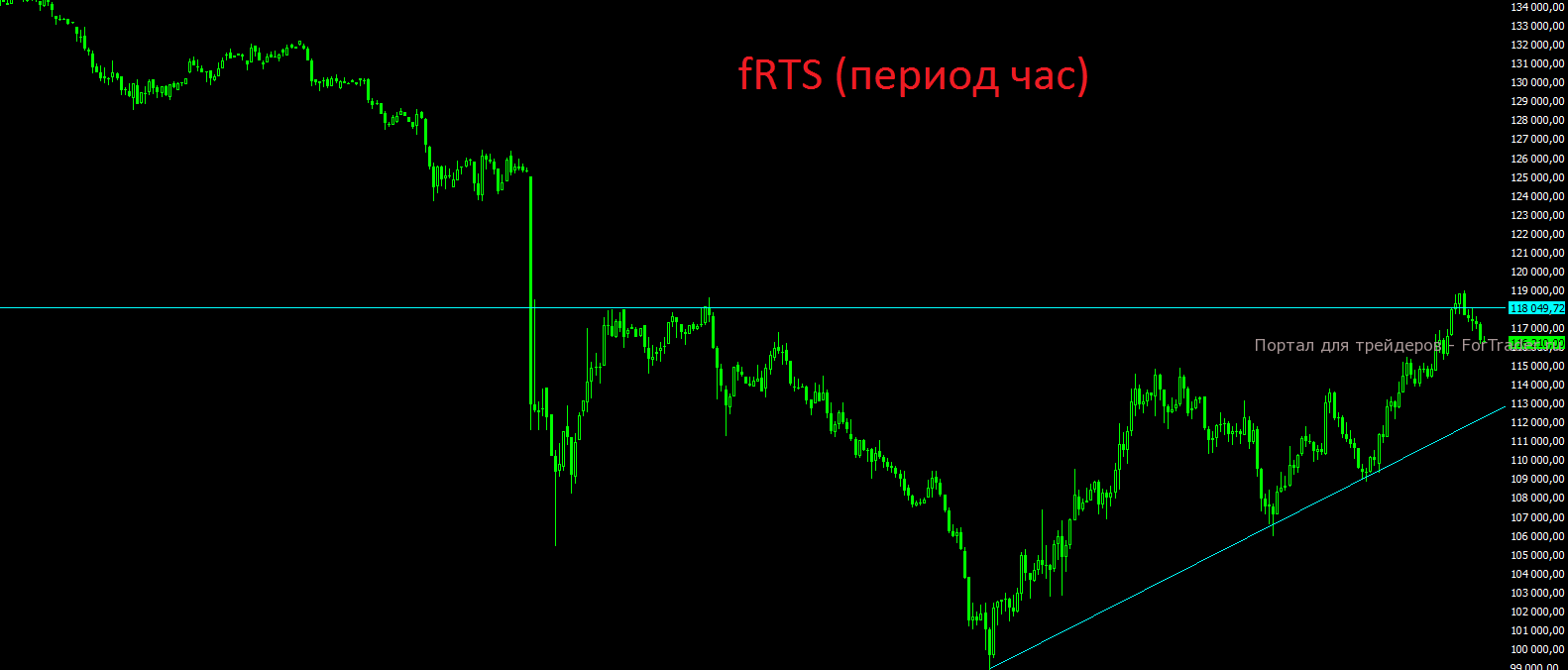 Одновременно с этим фьючерс на индекс РТС чётко достиг обозначенный уровень сопротивления на отметке 118000 пунктов.