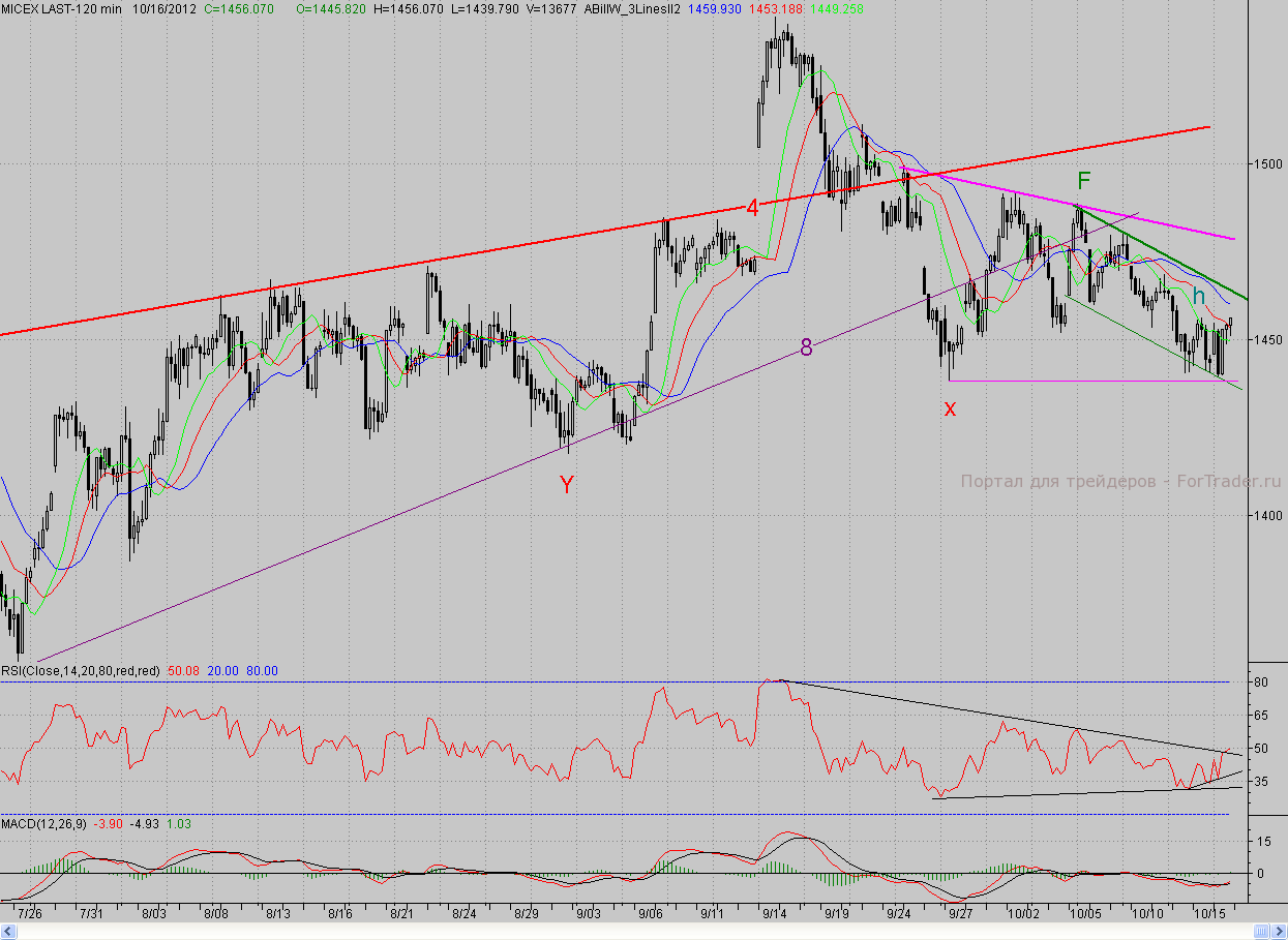 Сегодня ближайшим сопротивлением будет фрактал h, а далее – краткосрочный падающий тренд. Более сильным редутом «медвежьей» обороны остаётся верхняя грань «треугольника». Роль ближайшей поддержки сыграет район вчерашних вечерних минимумов (~1450 п.), основной остаётся фрактал Х.