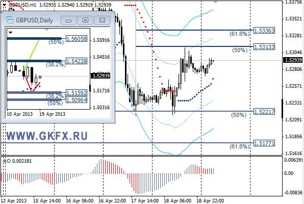 Пара GBPUSD росла более уверенно за счет сильных данных по розничным продажам в Великобритании. Я придерживался прогнозных слабых значений. В результате по рекомендации -20 пунктов. Сегодня можно попробовать продавать в расчете на выплеск вверх и последующее снижение, так как сегодня данных не ожидается, и снижение может возобновиться. Не забываем ставить безубыток при первой же возможности. На этой неделе по традиции рассматриваю два варианта возможного движения цены, основной красный и альтернативный зеленый. Значимые уровни на сегодня отмечены на часовом графике. Индикатор АО находится в положительной зоне и снижается, указывая на коррекцию перед возможным продолжением роста. Индикатор тренда указывает на рост.  Sell от 1,5335 или выше со стопом 1,5350. Цель 1,5280.