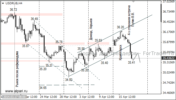 Сегодня не стоит ожидать продолжительного роста российской валюты. На это есть две причины. Во-первых, Б. Обама напомнил о третьем пакете санкций, если Штаты не увидят улучшения ситуации на Украине после вчерашней встречи. Во-вторых, в Страстную Пятницу биржи большинства европейских стран будут закрыты. Сегодня не работают банки Великобритании, Германии, Австралии, Канады, Новой Зеландии и Швейцарии. В США фондовый рынок работает по сокращённому графику в преддверии пасхальных праздников. В этот период активность на валютном рынке традиционно падает.