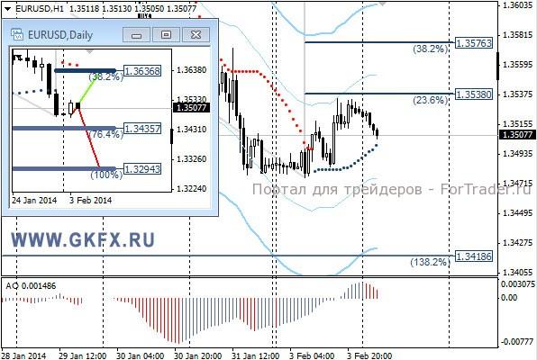 Пара GBPUSD на протяжении всего дня снижалась и потеряла значительную часть позиций. Отчасти это связано со слабым производственным PMI по Великобритании, а больше всего внесли вклад кросс-курсы. Пара прошла запланированное снижение на неделю за вчерашний день. По этой причине затруднительно предположить дальнейшее поведение пары. На этой неделе по традиции рассматриваю два варианта возможного движения цены, основной красный и альтернативный зеленый. Значимые уровни на сегодня отмечены на часовом графике. Индикатор АО находится в отрицательной зоне и растет, указывая на коррекцию перед возможным продолжением снижения. Индикатор тренда указывает на снижение. Вне рынка.