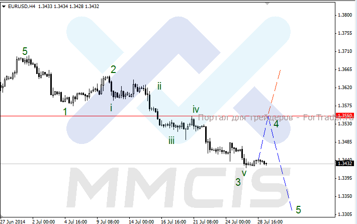 Первый день недели не принес изменений в волновой картине пары евро/доллар. Сформировался новый уровень поддержки 1.3430, который выступает минимумом локальной третьей волны падения.