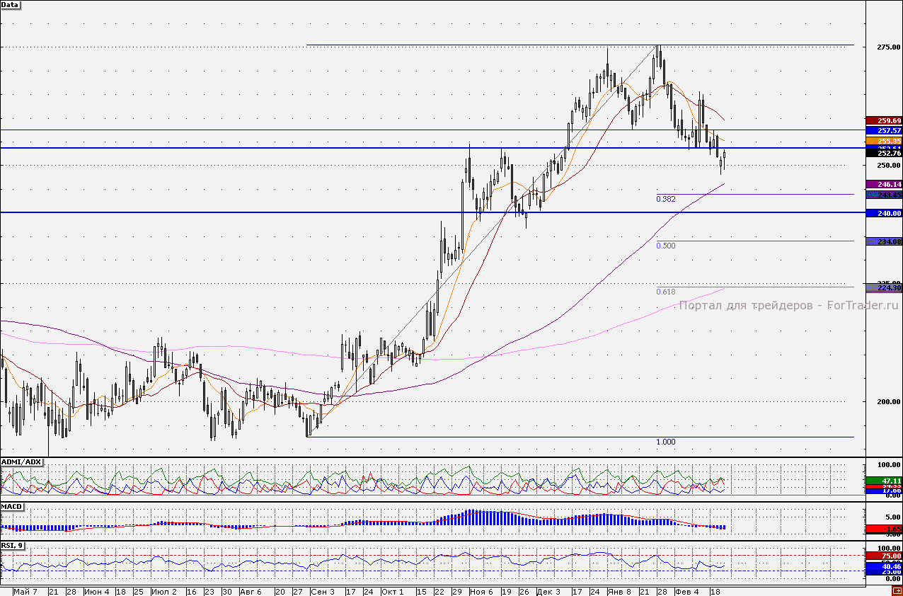 Акции «Роснефти» накануне тестировали поддержку 250 руб., но закрепиться ниже данного уровня не удалось. Сегодня акции продолжают отскок. Ближайшим сопротивлением выступает отметка 253,60 руб., далее 10-дневная скользящая средняя, проходящая в районе 255,35 руб. Однако сформировать более мощный рост от данной отметки акциям будет достаточно затруднительно. Кроме того, трендовые индикаторы свидетельствуют о  том, что силы «медведей» по бумагам все еще преобладают. Линия «медведей» индикатора ADMI/ADX находится выше линии «быков», при этом линия ADMI находится достаточно высоко. Также все еще не исключает продолжения нисходящего движения график индикатора MACD(12;26;9) график которого снижается на отрицательной территории. Таким образом, от ближайшего сопротивления спекулятивные «лонги» стоит закрывать. Наш 30-минутный торговый робот открыл длинные позиции от отметки 251,07 руб.