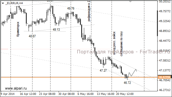 Евро и доллар снижаются к рублю пятый день подряд. Недельные потери по евро составили около 85 копеек или 1,76%, по доллару – 45 копеек или 1,12%. Курс доллара дошёл до целевой зоны 34,20. Недельный минимум зафиксирован на отметке 34,21. Курс евро на фоне падения евро/доллара снижался до 46,72. Технические условия для отката выполнены, и если учесть в прогнозе предстоящие президентские выборы на Украине, то в пятницу перед выходными надо ожидать по рублёвым парам коррекцию.