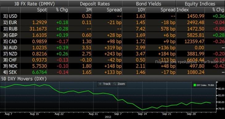 Накануне ведущие американские индексы закрылись в плюсе (NASDAQComposite+0,49%, DowJones+0,09%, S&P500 +0,36%). Поддержку американскому рынку оказали статистические данные. Число занятых в несельскохозяйственном секторе экономики (по данным ADP) в сентябре выросло на 162 тыс. против прогноза в 143 тыс. Значение индекса деловой активности в сфере услуг ISM также оказалось лучше ожидаемого (55,1 против прогноза в 53,2). Торги в Европе завершились разнонаправленным движением ведущих индексов. В плюсе оказались немецкий DAX(+0,22%), британский FTSE100 (+0,28%) и голландский AEX(+0,23%). В красной зоне закончился день для CAC40 (-0,24%) и швейцарского SMI(-0,14%).