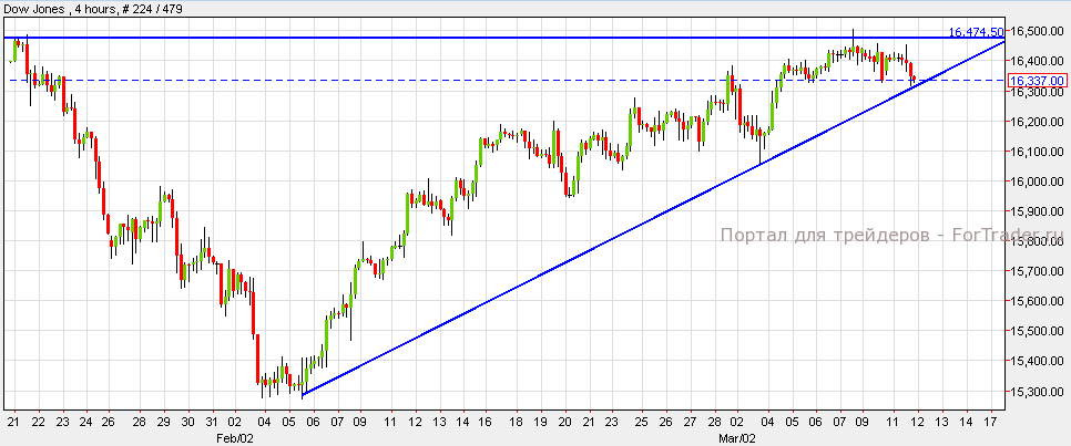 Уолл-стрит завершила торговый день в красной зоне несмотря на позитивное начало торговой сессии. За последние 5 лет, оборот рынка вырос на 170% и продолжает стремительно расти. Инвесторы обеспокоены долгосрочным восходящим трендом. S&P 500 упал на 0.51%, NASDAQ упал на 0.40%, а Dow Jones снизился на 0.41%. Согласно техническому анализу 4-часового графика, Dow Jones сформировал фигуру «треугольник». Если индекс опустится ниже уровня поддержки 16,300, он может упасть к отметке 16,000, или даже к отметке 15,300. Сегодня в 17:01 GMT состоится аукцион 10-летних облигаций.