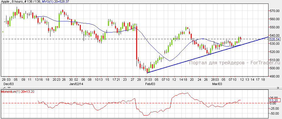 Акции Apple подорожали на 0.97% после того, как аналитики компании Pacific Crest Securities установили цену в $635 за акцию. Согласно техническому анализу 8-часового графика, акции Apple торгуются на восходящем уровне поддержки. Пока акции задерживаются выше уровня поддержки 525, продолжится восходящий тренд и цена может вырасти к 550 пунктам. Индикатор Momentum находится выше 0 и поддерживает восходящий тренд.