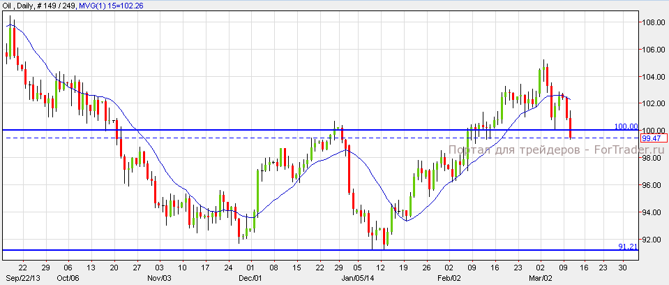 Нефть подешевела на 1.45% составив $99.47 за баррель. Согласно техническому анализу дневного графика, нефть пробила ключевой уровень поддержки 100.00 и торгуется с сильным нисходящим трендом. Следующий уровень установился на отметке 98, и если нисходящий тренд продолжится без коррекции, нефть может упасть к отметке 91. 15-дневная скользящая средняя поддерживает нисходящий тренд. Сегодня ожидается, что запасы сырой нефти составят 2.1 млн против 1.4 млн ранее.