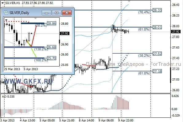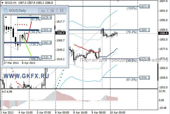 Цены на золото вышли на новые рубежи, отметившись на максимумах, за пять дней. Похоже ситуация в Северной Корее дает о себе знать. План по формированию диапазона отменился, и по рекомендации продажа закрылась в ноль. Возможность поставить безубыток была. Пробуем продать в расчете, что вчерашний High, это верхняя граница нового диапазона, при первой же возможности ставим безубыток. Традиционно делаю два варианта движения цены на неделю, основной красный и альтернативный зеленый. Значимые уровни на сегодня отмечены на часовом графике. Индикатор АО в положительной зоне и снижается, указывая на коррекцию перед возможным дальнейшим ростом. Индикатор тренда указывает на рост. Зайдем против индикаторов. Sell от 1590,0 или выше со стопом 1595,0. Цель 1573,0.
