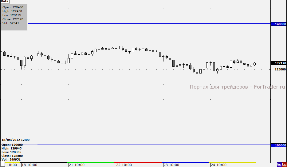 Четверг на срочном рынке прошел без существенных изменений котировок. Фьючерс на индекс РТС остался на уровне закрытия вечерней сессии среды, то есть на отметке около 127 000 пунктов. Итоговые изменения составили плюс 2,27% в дневную сессию, из которых 2% – это рост состоявшийся еще в среду вечером, и минус 0,55% вечером в четверг.