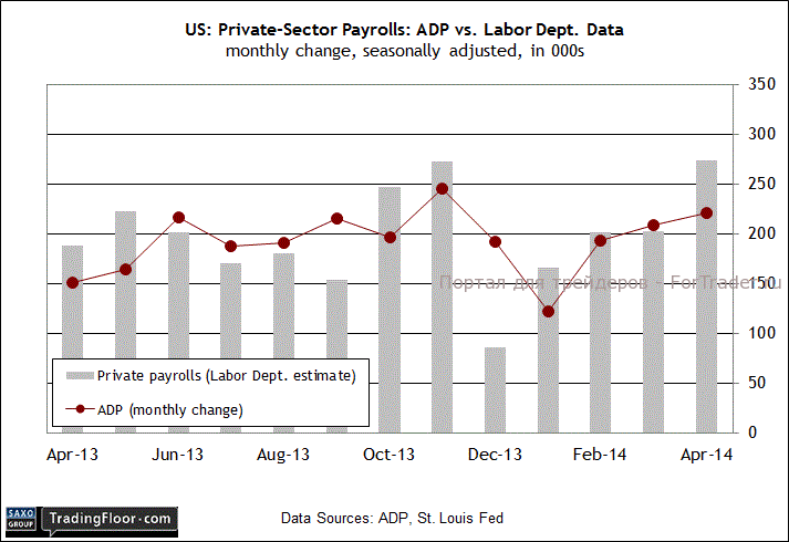 Конечно, делать прогнозы в отношении какого-либо одного статистического показателя сложно, но общая тенденция, демонстрируемая экономическими индикаторами, подкрепляет надежды на то, что умеренный рост занятости продолжится. Так, например, количество первичных заявок на пособие по безработице на прошлой неделе упало и приблизилось к значениям, которые в последний раз наблюдались в 2007 году. Между тем индекс менеджеров по закупкам (PMI) в производственном секторе США (составляется компанией Markit) в прошлом месяце отметился самым сильным ростом с начала 2011 года, а его компонент занятости показывает небольшой, но устойчивый рост. Принимая во внимание эти и другие статистические доказательства, вполне разумно предположить, что сегодняшний выпуск ADP подтвердит тенденцию, пусть и не к блестящему, но стабильному росту на рынке труда.