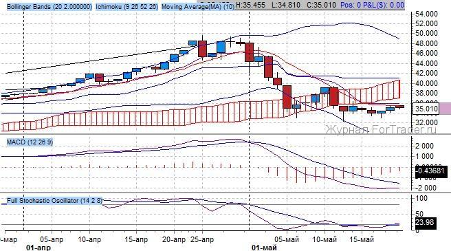 Котировки установили исторический максимум на отметке 49.75. После чего наметился разворотный импульс к нижней границе повышательного канала на 34.00 $/тройскую унцию. Текущая комбинация японских свеч «утренняя звезда» реализует свой повышательный потенциал к 38 $/тройскую унцию.