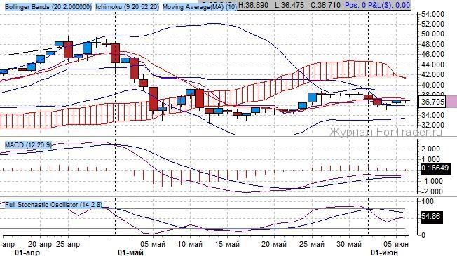 Согласно показателям индикатора Ишимоку среднесрочный тренд понижательный, котировки реализуют продажи с выходом из «Облака Ишимоку» и демонстрируют фазу развития. Ключевой уровень сопротивления расположен на отметке 48.00 $/тройскую унцию. Согласно показаниям индикатора, значимым уровнем поддержки стоит признать уровень 34.00 – проторгованная область по ключевой медленной индикатора. Будущая цель роста 40 $/тройскую унцию – верхняя граница динамического канала.