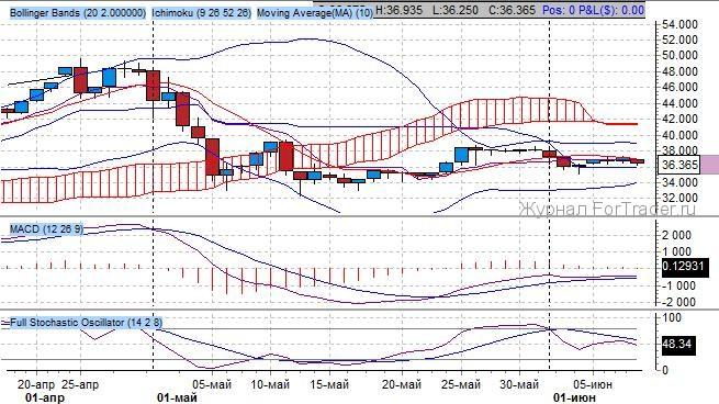 Согласно показателям индикатора Ишимоку среднесрочный тренд понижательный, котировки реализуют продажи с выходом из «Облака Ишимоку» и демонстрируют фазу развития. Ключевой уровень сопротивления расположен на отметке 48.00 $/тройскую унцию. Согласно показаниям индикатора, значимым уровнем поддержки стоит признать уровень 34.00 – проторгованная область по ключевой медленной индикатора. Будущая цель роста 40 $/тройскую унцию – верхняя граница динамического канала.