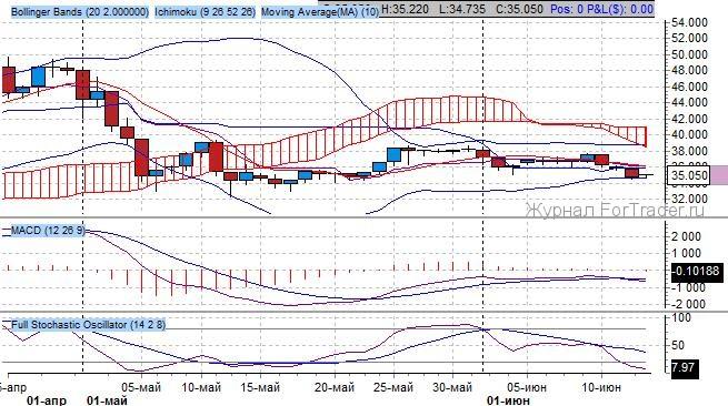 Котировки установили исторический максимум на отметке 49.75. После чего наметился разворотный импульс к нижней границе повышательного канала на 34.00 $/тройскую унцию. Текущая комбинация японских свеч «медвежье поглощение» реализует свой понижательный потенциал до уровня поддержки на 36.00 $/тройскую унцию, сохранение уровня поддерживает перспективы роста к уровню 40 $/тройскую унцию в рамках приемлемого соотношения риск/доходность. Отмечаем удобный момент для покупок по фьючерсу от уровней 34 и 36 $/тройскую унцию. Предлагаем удерживать длинные позиции по фьючерсу.