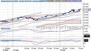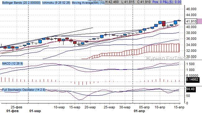 Согласно показателям индикатора Ишимоку среднесрочный тренд повышательный, котировки завершают подъем над верхней границей «Облака Ишимоку» и демонстрируют завершающую фазу роста. Ключевой уровень сопротивления расположен на отметке 42.00. Согласно показаниям индикатора, значимым уровнем поддержки стоит признать же уровень 34.00 – проторгованная область по ключевой медленной индикатора.