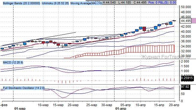 Согласно показателям индикатора Ишимоку среднесрочный тренд повышательный, котировки завершают подъем над верхней границей «Облака Ишимоку» и демонстрируют завершающую фазу роста. Ключевой уровень сопротивления расположен на отметке 44.00. Согласно показаниям индикатора, значимым уровнем поддержки стоит признать же уровень 36.00 – проторгованная область по ключевой медленной индикатора.