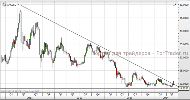 Из двух металлов наибольшую динамику роста показало серебро. На приведенном ниже графике видно, что сейчас металл находится в процессе прорыва линии тренда, которая служила сопротивлением с апреля 2011 года, когда серебро почти достигло отметки 50 долларов за унцию.