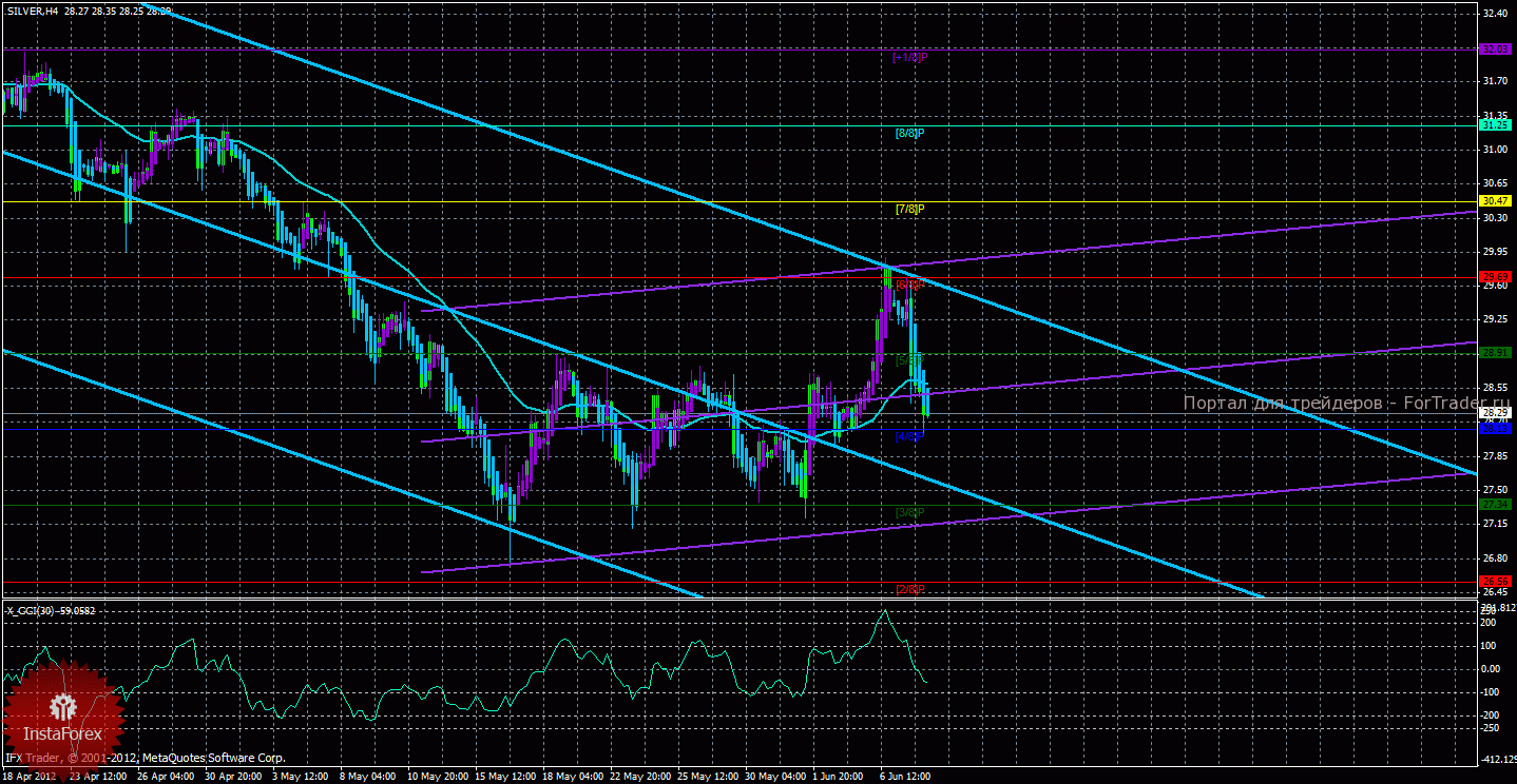 Исходя из анализа серебра 8 июня, видно, что цена вновь закрепилась ниже скользящей средней, также развернулся вниз младший канал линейной регрессии, поэтому сейчас определяющим индикатором является мувинг. Старший канал направлен вниз, что свидетельствует о нисходящем направлении движения глобального тренда. Младший канал развернулся вверх, что означает восходящее движение в менее долгосрочном плане. Сейчас цена находится ниже мувинга и ниже уровня Мюррея «5/8», что делает более вероятным продолжение нисходящего движения. Первой целью нисходящего движения является уровень Мюррея «4/8» — 28,13, который уже достигнут в ходе последнего понижения цены. Если курс серебра сумеет закрепиться ниже этого уровня, то нисходящее движение может продолжиться с целью «3/8» — 27,34. Скользящая средняя направлена вбок, а цена в свою очередь находится ниже нее, что сигнализирует о текущем нисходящем направлении движения. Длинные позиции будут вновь актуальны только после закрепления цены выше мувинга с целью 29,69. Хайкен Аши окрасил последние бары в голубой цвет, что сигнализирует о локальном нисходящем движении, до разворота этого индикатора наверх рассматривать короткие позиции можно. Индикатор CCI находится около уровня -100, что свидетельствует о небольшой перепроданности инструмента.