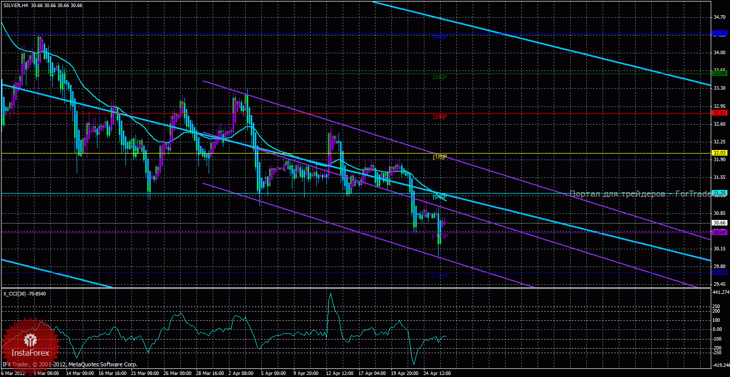 Исходя из анализа серебра 26 апреля, видно, что нисходящее движение усилилось, этот факт вновь позволяет нам в полной мере рассматривать короткие позиции, все индикаторы указывают на нисходящее движение. Старший канал направлен вниз, что свидетельствует о нисходящем направлении движения глобального тренда. Младший канал направлен вниз, что означает нисходящее движение в менее долгосрочном плане. Сейчас цена находится ниже мувинга и ниже уровня Мюррея «0/8», что делает более вероятным продолжение нисходящего движения. Первой целью нисходящего движения является уровень Мюррея «-1/8» — 30,47, который уже был достигнут 2 раза, но по-прежнему не преодолен. В случае преодоления первого целевого уровня, нисходящее движение может продолжиться с целью «-2/8» — 29,69. В случае достижения уровня «-2/8», все уровни Мюррея перерасчитаются и мы получим новые цели для торговли. Скользящая средняя направлена вниз, а цена в свою очередь находится ниже нее, что сигнализирует о текущем нисходящем направлении движения. Длинные позиции будут вновь актуальны только после закрепления курса выше мувинга и разворота одного из каналов регрессии наверх. Хайкен Аши окрасил последние бары в фиолетовый цвет, что сигнализирует о локальном восходящем движении, поэтому для открытия новых ордеров на продажу следует дождаться разворота этого индикатора вниз. Индикатор CCI находится около уровня -100, что свидетельствует о слабой перепроданности инструмента.